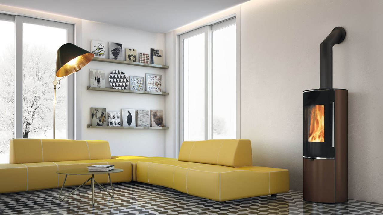 Poêles à bois de marque EDILKAMIN avec une vitre verticale galbée qui exalte la vision de la flamme.